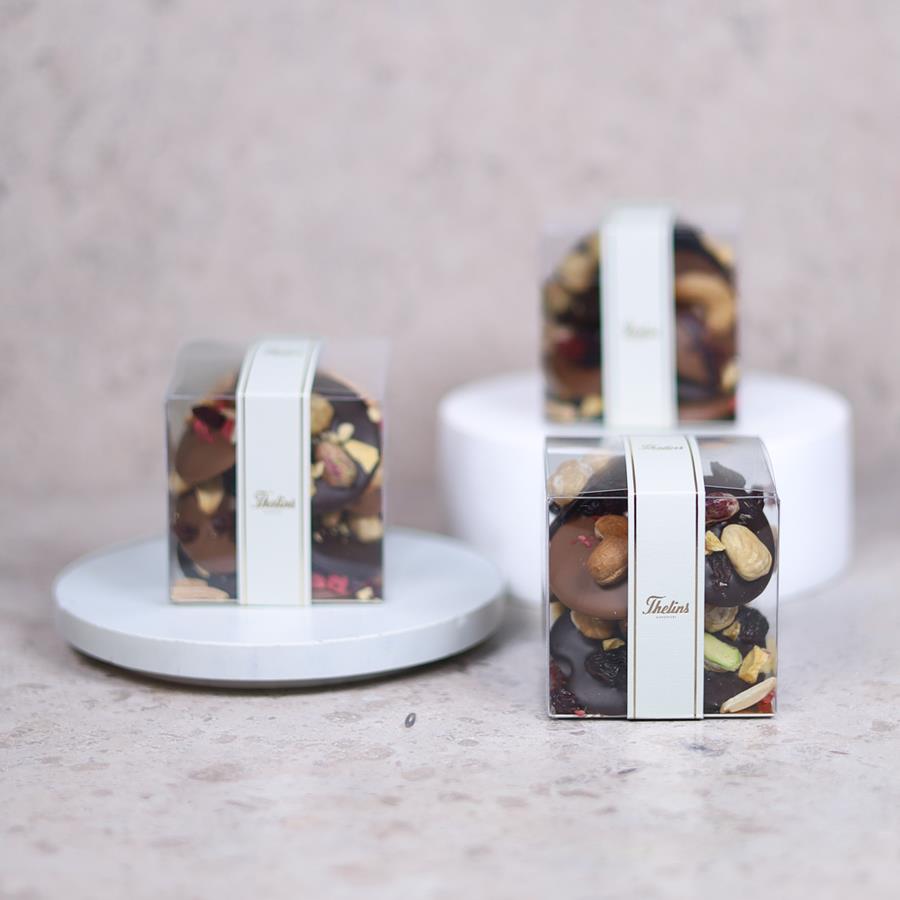 Ljuvliga chokladmynt gjorda på mörk 70% och ljus 36,5% choklad från Chocovic. Toppade med nötter och torkad frukt
