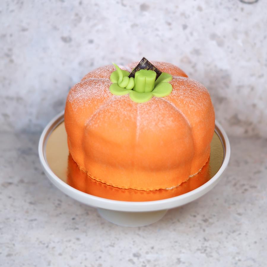 Klassisk prinsesstårta med glutenfri botten i höstskrud, täckt med orange marsipan formad som en pumpa. OBS finns endast i 12 bitar!