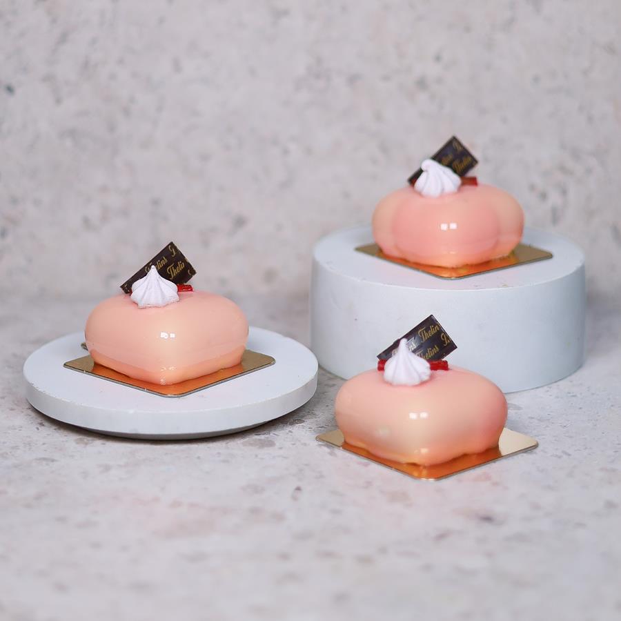 En härligt somrig tårta med tydlig rabarbersmak och touch av jordgubbar. Mjuka mandelmarängbottnar med citronsmak, vit chokladkrisp och jordgubb/rabarberkompott. Omsluts av en len mascarponemousse och ljusrosa glaze.