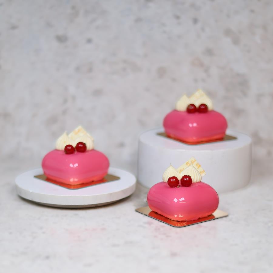 Mandelbotten, vaniljmousse, svartvinbärscremeaux (kräm) och svartvinbärsgelé. Omsluts av lila glaze och dekoreras med vaniljmousse och vinbär